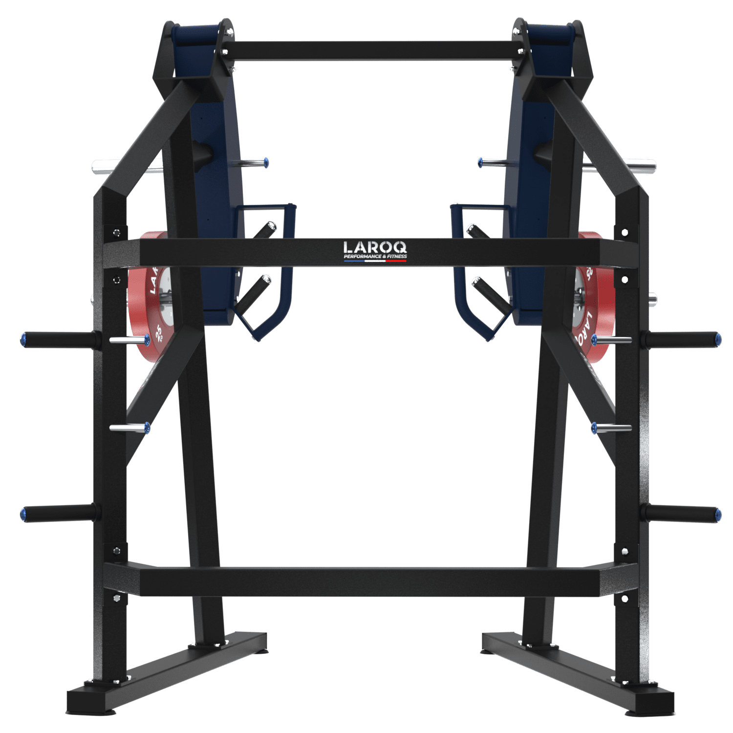 Machine de développé vertical à charge libre (levier) conçue pour l'entraînement des épaules et du haut du corps. Cadre métallique noir, bras articulés recouverts de panneaux bleus, poignées ergonomiques en U, porte‑disques latéraux chargés de disques rouges LAROQ 25 kg, supports de rangement de disques intégrés et base stable. Vue profilMachine de développé vertical à charge libre (levier) conçue pour l'entraînement des épaules et du haut du corps. Cadre métallique noir, bras articulés recouverts de panneaux bleus, poignées ergonomiques en U, porte‑disques latéraux chargés de disques rouges LAROQ 25 kg, supports de rangement de disques intégrés et base stable. Vue arrière